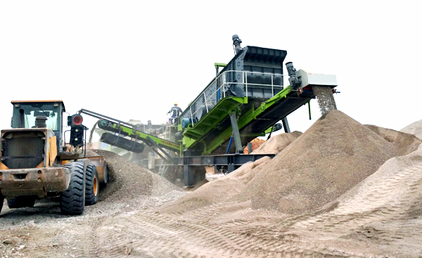 華潔公司移動式建筑垃圾處理設備正在破碎篩分建筑垃圾,生成不同粒度的骨料